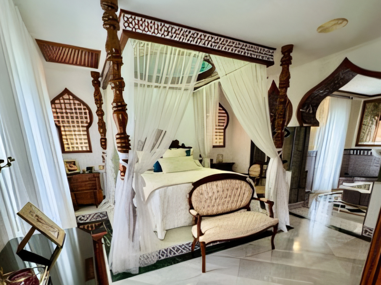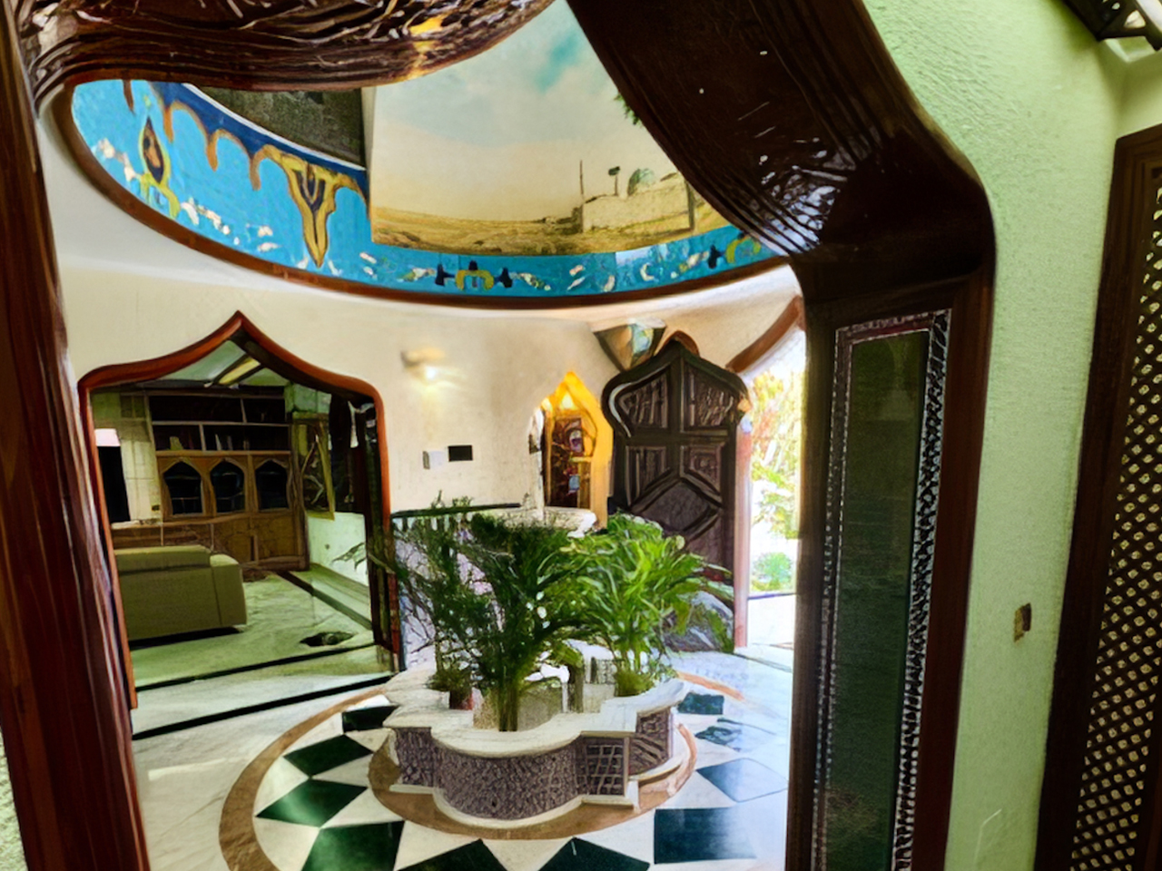 La Villa Árabe es un oasis de lujo inspirado en las Mil y Una Noches, situada junto al Paraje Natural de Punta Entinas-Sabinar y a tan solo 10 minutos de la playa. Su imponente cúpula azul es el centro visual de la villa, evocando la grandeza y la magia de los antiguos palacios árabes. Los interiores son igualmente impactantes, decorados con frescos originales del renombrado artista Waldi Wrobel, celosías iluminadas, y fuentes árabes interiores que añaden serenidad y elegancia a los espacios. Los suelos de mármol, arcos de madera tallada, azulejos andalusí y nazari, y carpintería de pino tea crean una atmósfera de lujo y exotismo. El dormitorio principal, con una cama de dosel y baño en suite, se abre a una gran terraza con vistas al jardín.